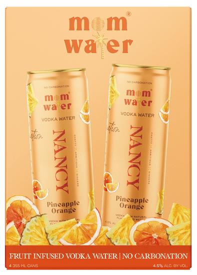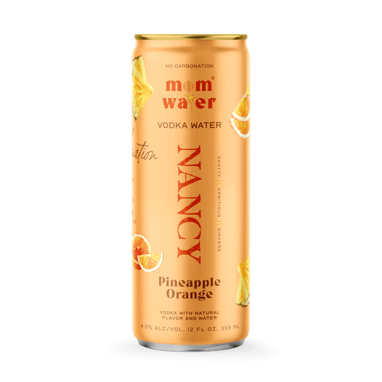 Meet Nancy - Pineapple Orange Vodka Water. That’s right - no carbonation. Mom Water has zero sugar, zero carbs, and no artificial flavors or preservatives.